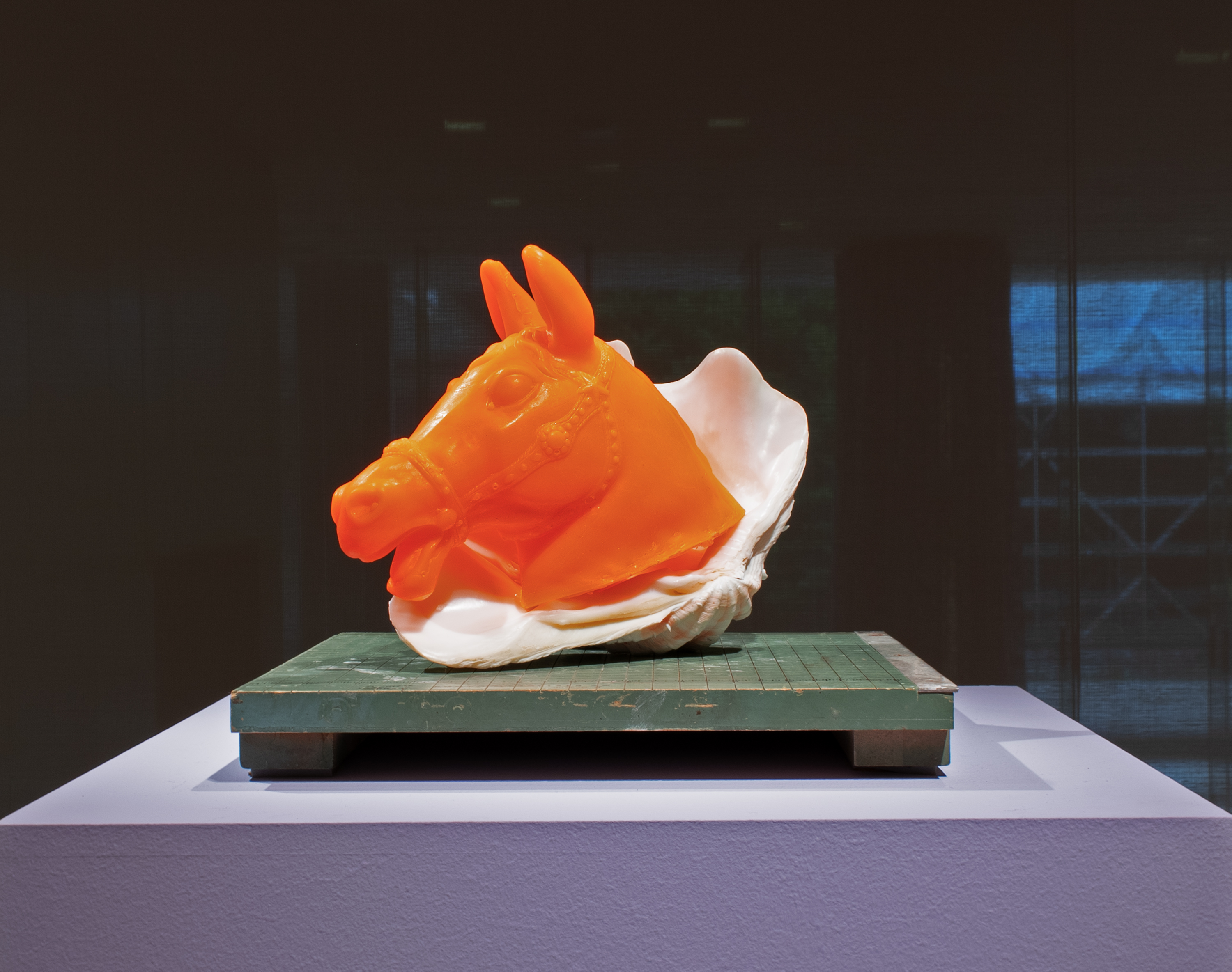 cast Dragon Skin silicone, pigment, clam shell, ceramic support, found antique paper cutter. roughly 12 x 13 x 15 inches. March 2024.