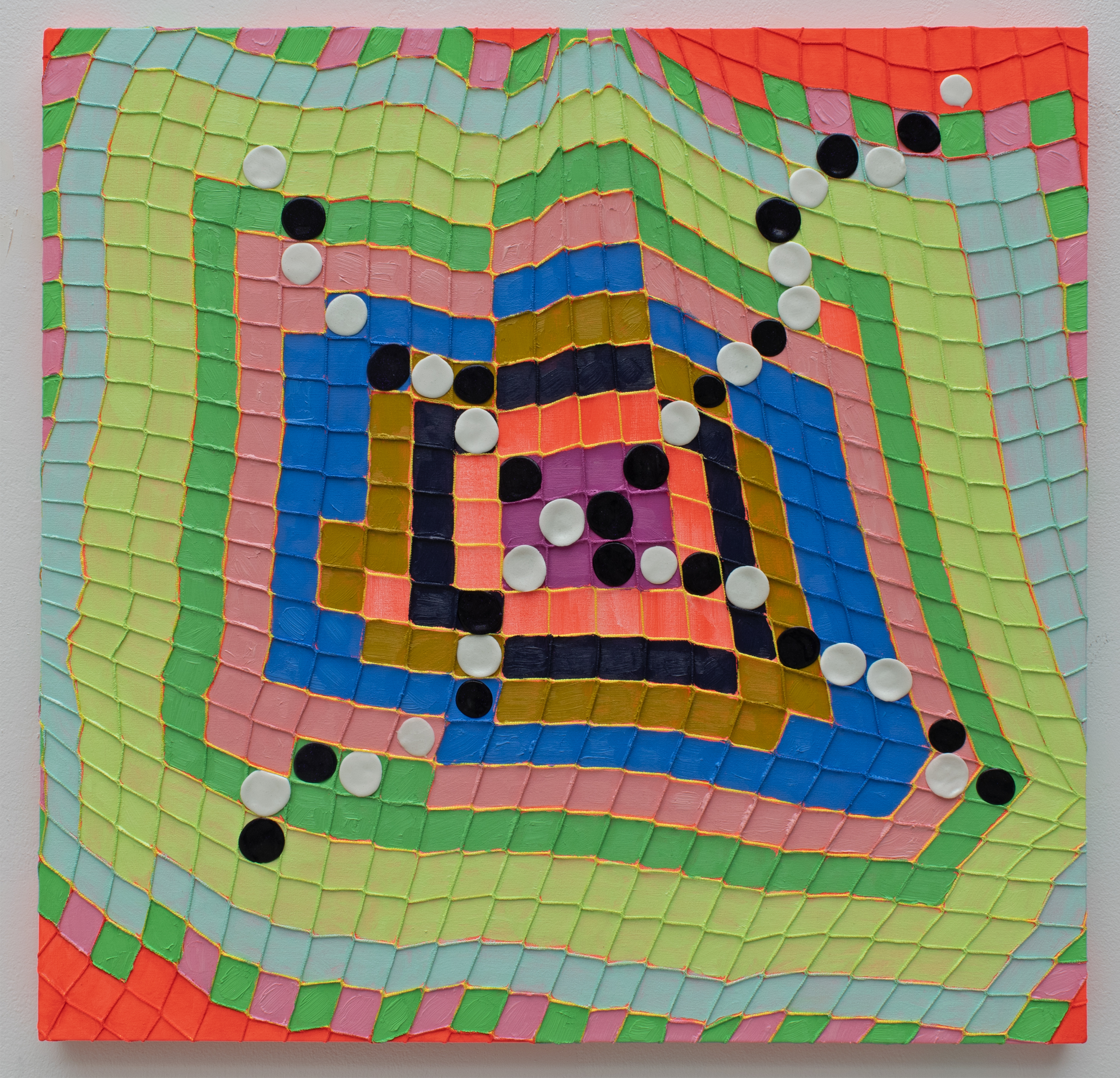 Oil, acrylic, colored pencil, netting, and pigmented dragon skin silicone on canvas over panel. 60 x 60 inches, February 2024.
