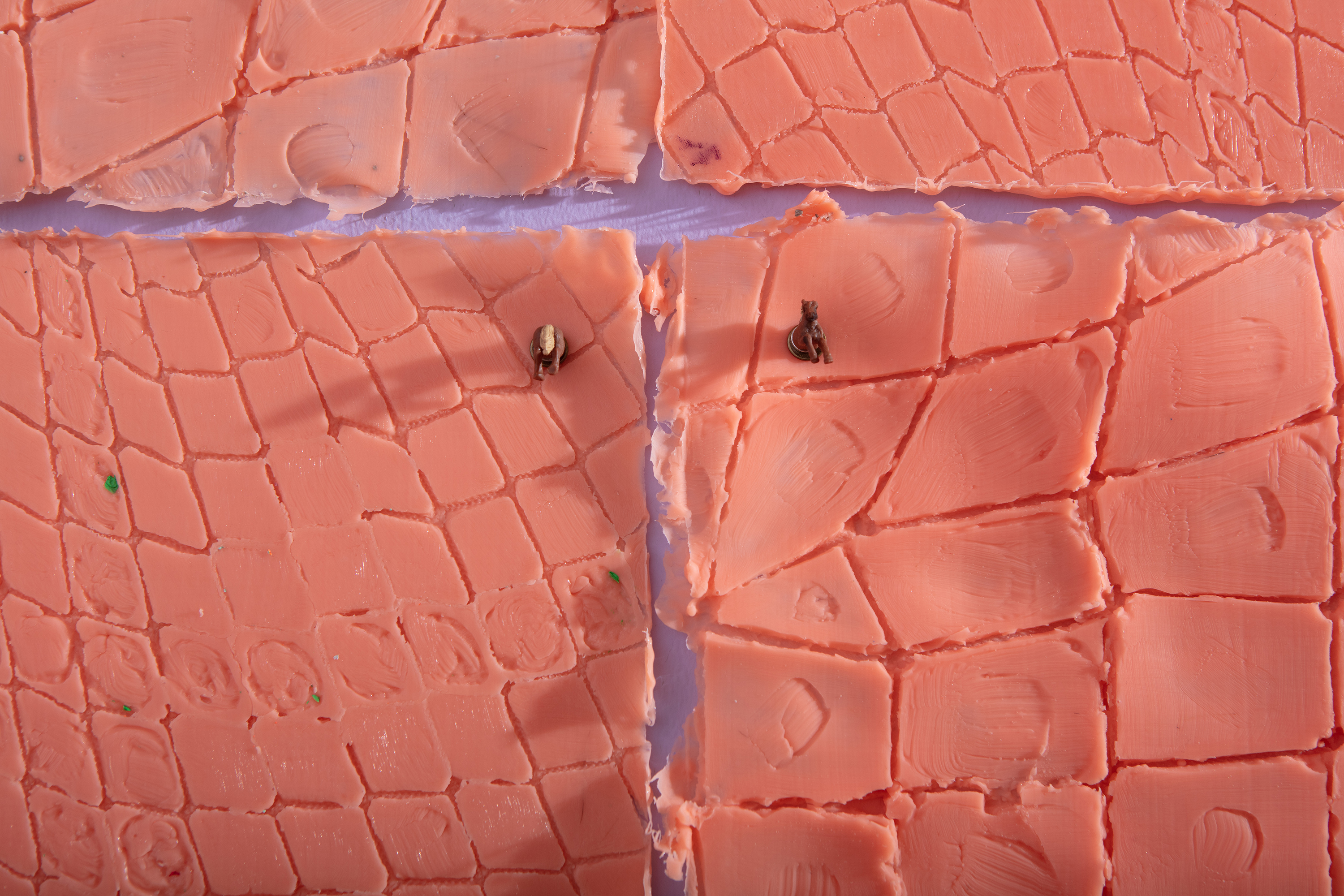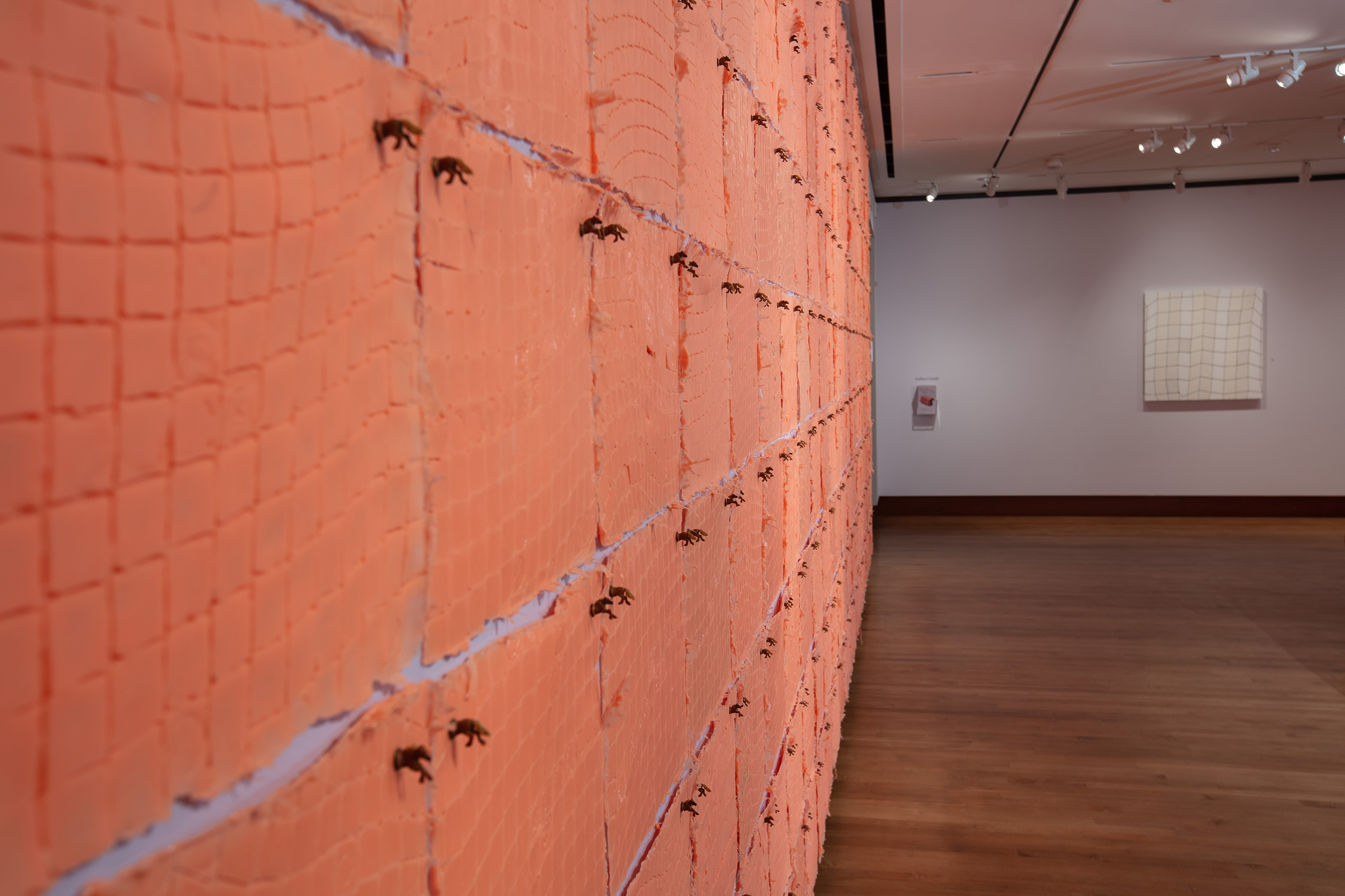 207 rebound-25 silicone tiles cast from the surfaces of three paintings; upholstery tacks; magnets; miniature pony figurines, 102 x 328 inches (dimensions variable). April 2024. Courtesy of the Chazen Museum of Art, University of Wisconsin‒Madison.